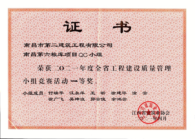 4月27日,江西省建筑業(yè)協(xié)會召開全省建筑業(yè)全面質(zhì)量管理成果發(fā)布會,我司報送參賽的南昌第六糧庫項(xiàng)目QC小組的《提高軟弱地基強(qiáng)夯施工一次驗(yàn)收合格率》QC成果和滕王閣項(xiàng)目QC小組的《提高古建砼戧梁驗(yàn)收合格率》QC成果獲得一等獎,繩金塔項(xiàng)目QC小組的《提高高空弧形挑檐施工質(zhì)量》QC成果獲得二等獎,為促進(jìn)企業(yè)技術(shù)創(chuàng)新和科技進(jìn)步、提升企業(yè)品牌形象添勁加力。